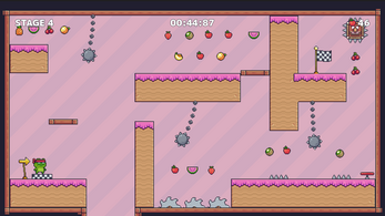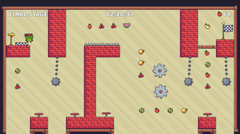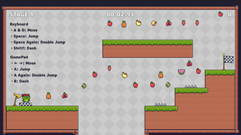 Scoring System: Your score is calculated by multiplying the number of fruits collected by 10, and then subtracting the time taken to complete the levels. The goal is to collect as many fruits as possible while finishing each stage quickly!